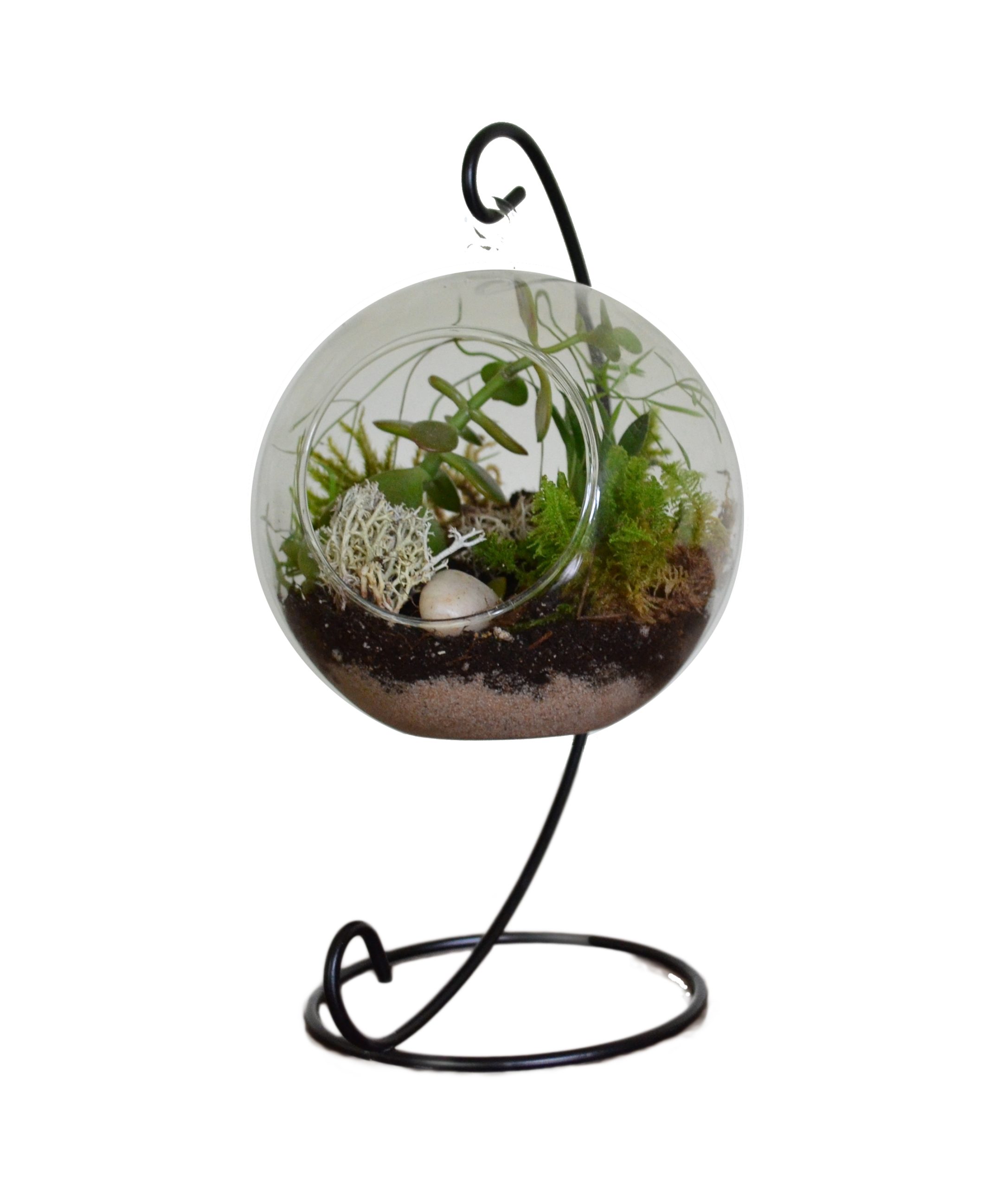 Globe terrarium hanging on a candlestick. Local and tropical plants nicely arranged into a decorative glass ball.